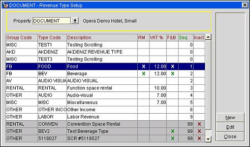 To add a new, or edit an existing Revenue Type, select the New or Edit buttons. The Revenue Type - New or Edit screen display. Select the Revenue Group and enter the Revenue Type. Next, enter a description of the Revenue Type. Finally, set the VAT%, Display Sequence, F&B and/or the Inactive flags as necessary. Options that are not standard on this screen are described below.