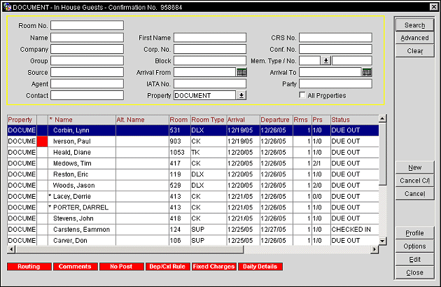 You can cancel a checked-in reservation if the guest has checked in today and does not have a balance. For example, the wrong guest was checked-in. Select the Front Desk > In House Guest Search. The following screen appears.