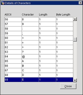 List ASCII. Displays the ASCII Value and the associated Character Value, along with its length and byte length for reference.