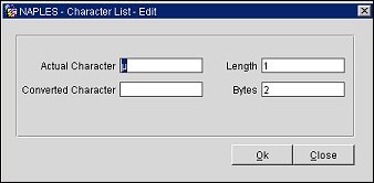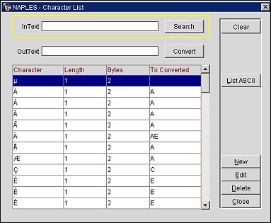 At the Character List screen you can search for characters that have been set up, create new character mapping, delete existing mapping, and edit existing mapping. You can also view the ASCII List of Characters for reference.