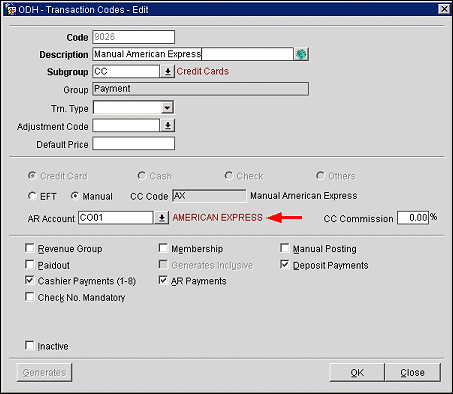 Note: The screen below shows the Credit Card option button selected. Alternatively, the Others option button could be selected for credit card payments that are direct billed to an AR account. In addition, the screen shot shows the Manual option button checked. The transaction code could also have been set up as EFT, which means that the credit card payment would go through the credit card interface and validation algorithms would be applied.