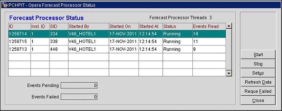 The forecast processor is started and stopped from the Forecast Processor Status screen. To display this screen, select Utilities > Processors > Forecast Processor.