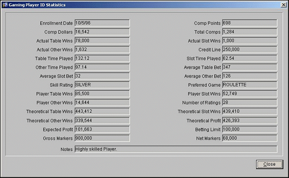 The Player Statistics screen provides an up-to-the-minute display of gaming information for a guest who has a player ID.