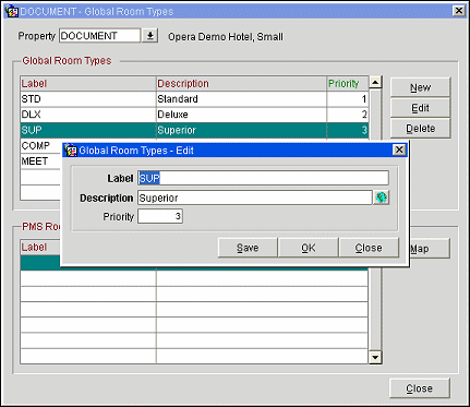 Global room types are logical categories that are set up to hold groups of "regular" room types which usually share similar characteristics. For example, a REG global room type might include the standard (STD) room type and the double (DBL) room type, both of which might be very much alike. Physical rooms would never be assigned to a global room type, although rooms would be associated with the regular room types that comprise the global room type.