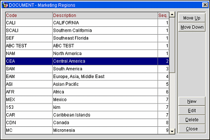 Seq. Sequence number that controls the position of the marketing region in listings. To reposition an entry in the list, highlight the record and select the Move Up or Move Down button.
