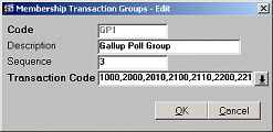 From the Transaction Groups screen you can create New, Edit, or Delete transaction groups. Select an existing membership transaction group and select Edit or New to create a new entry.