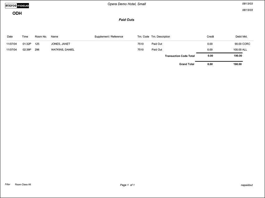 The Paid Outs Report displays all the paid-out transactions of the day to guests and is generated during the Night Audit sequence. Paid outs which affect the cash on and other paid-outs (sometimes known as non-revenue department codes) are important for the reconciliation of cash at the end of each day. Cash advances or deposit refunds and reimbursements are examples of paid out funds.