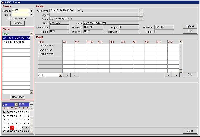 The Blocks area displays the configured business blocks based on the Search criteria entered or the date selected in the Calendar area.