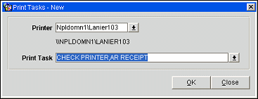 Print Task. Select the down arrow to choose the print task or tasks that you wish to have printed on the printer you selected in the Printer field. The multi-select Printer Tasks list lets you attach more than one print task at a time for each printer. You may not set up duplicate print tasks to the same printer.