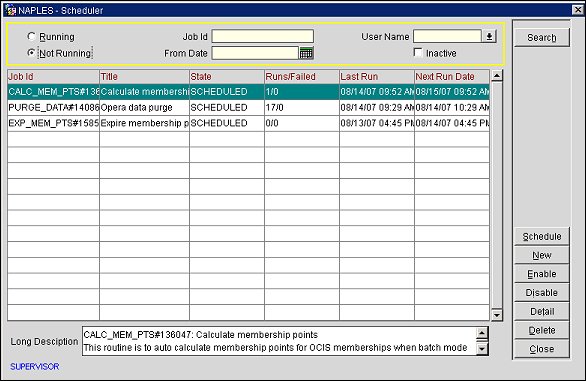 Users with the Supervisor permission will be able to view jobs and details, modify schedules, and delete all jobs running, scheduled to run, and not running by all users. Additionally, the supervisor can run and schedule new Scheduler procedures (i.e. OPERA Data Purge, Update Rooms, Calculate Membership Points, Expire Membership Points, OBI Cube Maintenance) directly from the OPERA Scheduler Procedures screen. The supervisor can also enable/disable procedures and make other modifications.