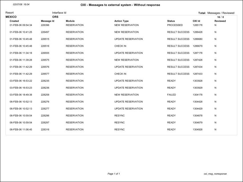 This sample report presents the following information as it pertains to the selected criteria on the Error Mining screen in the following order: Resort, Interface ID, Total Messages/Reviewed. The subsequent section contains the following columns; Created (which contains a date and time stamp of when the message was created), Message ID, Module, Action Type, Status, OXI ID and Reviewed Y/N.