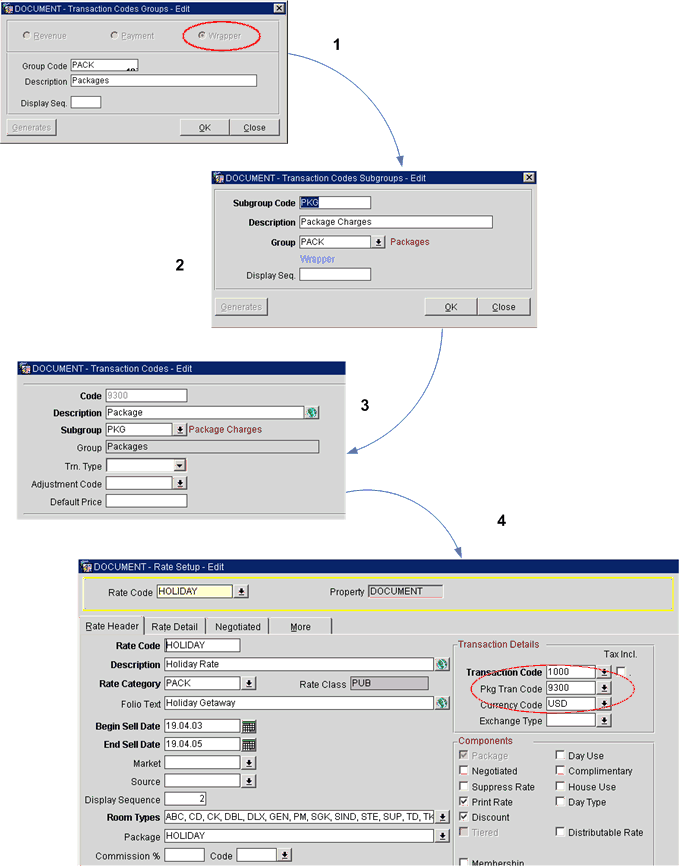 See diagram below. (1) Wrapper codes are set up under Configuration > Cashiering > Codes > Groups. (2) Subgroups are then associated with the wrapper group (Configuration > Cashiering > Codes > Subgroups) and, (3) the subgroups are in turn attached to transaction codes. These transaction codes are known as wrapper transaction codes or package transaction codes. (4) Finally, the wrapper transaction code is associated with a rate code in rate code setup (Rate Management > Rate Classifications > Rate Codes). When charges are attributed to any of the package elements included in that rate, those charges are linked to the wrapper transaction code.