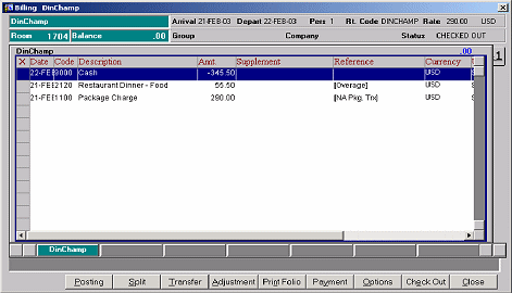 In this example, upon check-in the system generated the internal package credit for $20.00 being for champagne consumption. The butler forgot to take the bottle to the room so the property made a package profit. The system posted $20.00 to package debit to show this.