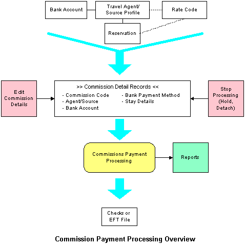 Commission payment processing is handled largely from the Commission Processing screen. Using this screen, travel agent and source details, bank account information, and guest reservations data are combined to determine the commission to be paid and the method of payment. As part of this process, commission details can be changed and new commission detail records can be added. You may also "stop processing" so that the commission on commission detail records is not processed for payment by either placing the commission detail record on hold, or by detaching the commission record from the agent or source. Finally, the Commission Processing screen can be used to generate reports of commission payments and bank transfers, to prepare commission checks, and to create EFT files for payment processing by a clearinghouse (if the EFT add-on feature is used at your property).