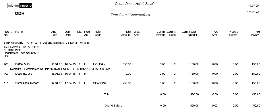 4. The Post Commission Payment report prints. This report shows the name of each agent/source being paid, guest names and stay dates and commission amounts included in each payment, and a total payment for the agent/source. The report also includes a grand total of all payments made to all agents and sources in this batch. This report reflects the same information that has been included in the EFT file.
