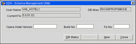 This screen shows the User Name, Database Alias, and Current Fix version number of the OPERA application currently in use.