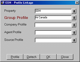 You may attach a group, company, travel agent, and source, profile to a room block by selecting the Profiles button on the Profile Linkage screen. You must attach a group profile to the standard group before you can save the block. Other profile types may be optionally attached.