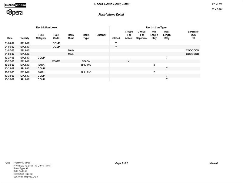 The report output will match the Rate Availability screen.  The Rate Availability screen is only available when the Setup>Application Settings>Rate Group>Advanced Rate Restriction Function is set to Y (in both PMS and ORS).