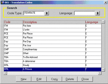 Because the Rate will most likely be the same for many different items, it is translated once using the Translation Codes screen. For example, per half day (English) par demi journée (French).