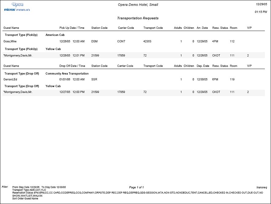 Use the Transportation report to display reservations that have requested Transportation service. The report will display those guests with Pickup or Drop Off = Yes and for which a transportation type has been selected.