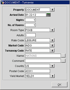 The Turnaways feature allows you to record statistical information related to turned away business. Turnaway business is sometimes classified as either regrets (e.g., when the guest declines to place a reservation because of price, property features, location of the property, etc.) or as denials (e.g., when the property cannot accept the reservation because inventory is sold out, or the desired rate or room type is not available). For example, assume a guest calls and wants to make a reservation at the Corporate Rate for July 17. If a review of the Rate Query screen shows that the Corporate Rate is not available on that date for that property, you can record the inquiry as a turnaway if the guest will not accept an alternate rate or date.